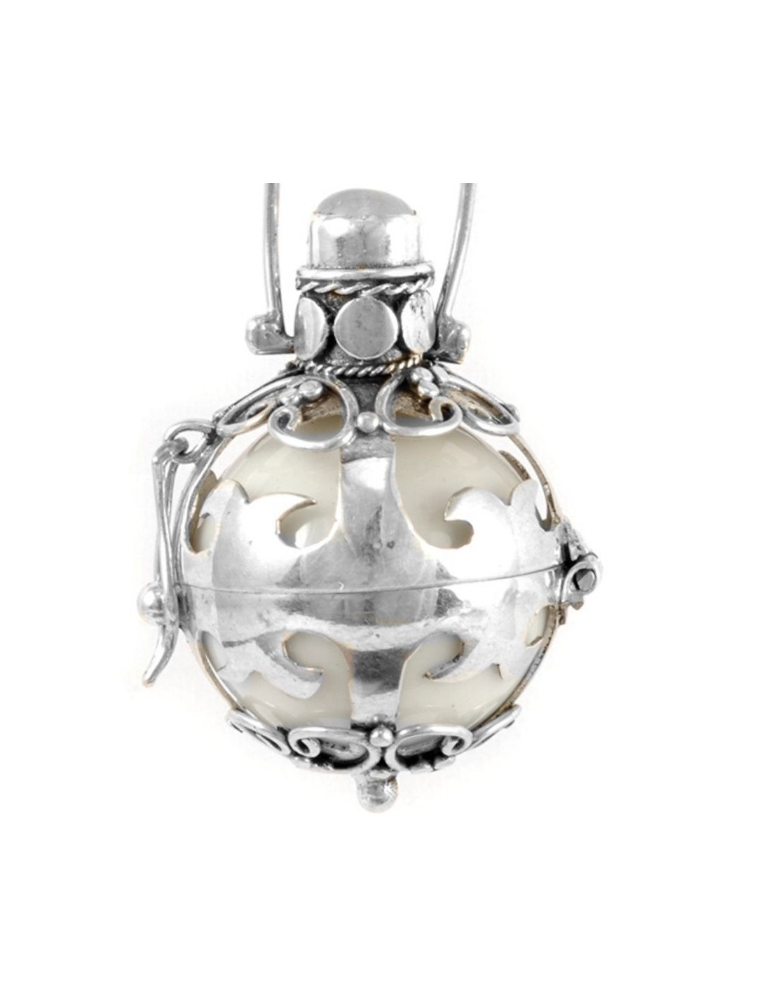 -€30.00 Product available with different options Silver Jewellery Silver Bola Cage with Coloured Ball Boutique Nirvana €35.83 €65.83 This magnificent bola cage pendant is handcrafted in sterling silver and adorned with spiral patterns forming elegant arabesques. The cage contains a ball of enamelled colour, either in white, black or turquoise. Fine black cord included. Every piece is handmade and completely unique. All products are fair trade. View