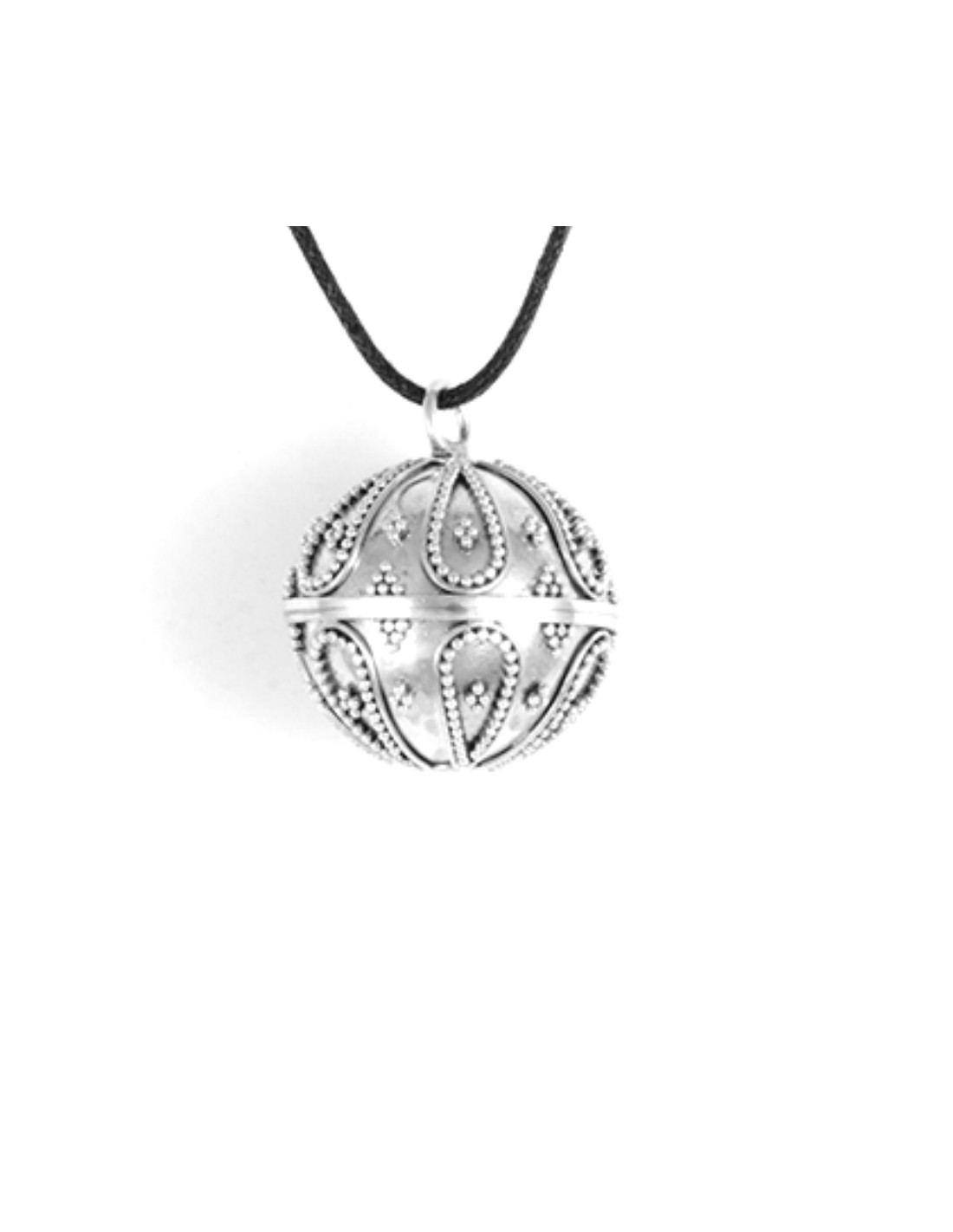 -€30.00 Product available with different options Silver Jewellery Silver Bola Cage with Coloured Ball Boutique Nirvana €35.83 €65.83 This magnificent bola cage pendant is handcrafted in sterling silver and adorned with spiral patterns forming elegant arabesques. The cage contains a ball of enamelled colour, either in white, black or turquoise. Fine black cord included. Every piece is handmade and completely unique. All products are fair trade. View