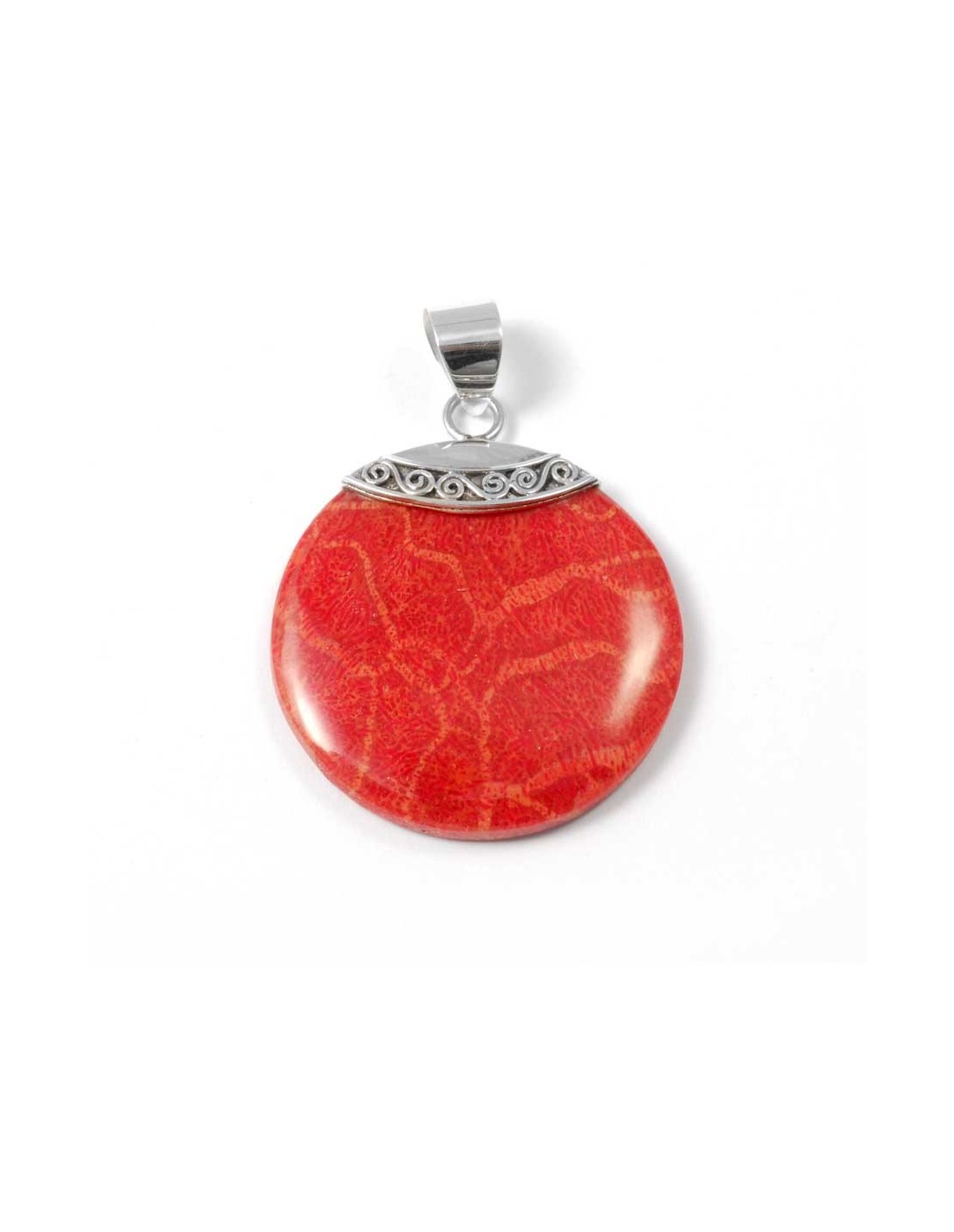 This delicate, charming round pendant has an elegant sterling silver bail and is available in Mother of Pearl, Coral or Blue Gorgonian.