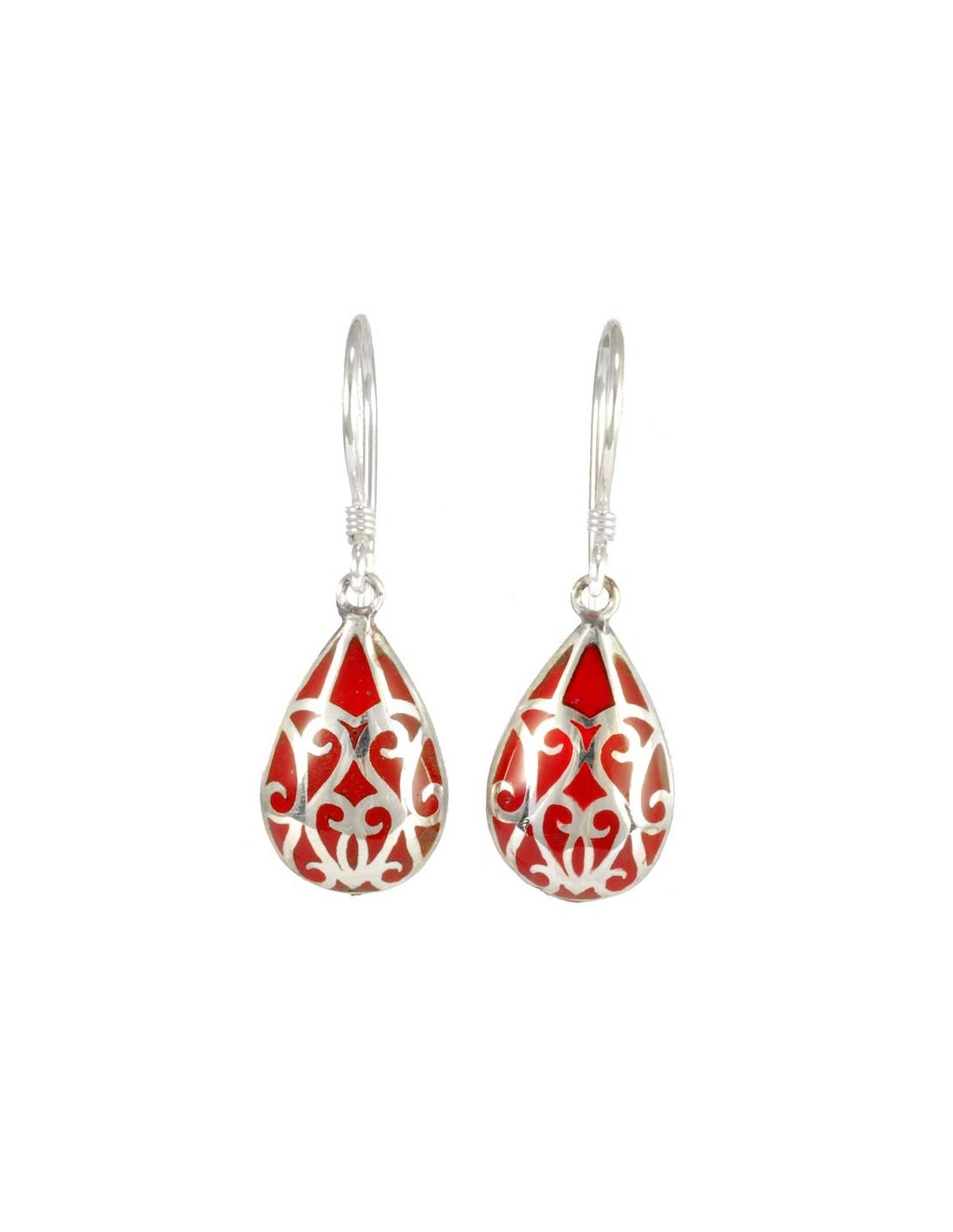 These unique, elegant earrings feature ornate handcrafted silverwork, and an eye-catching drop of enamelled colour. A beautiful pair of earrings that look and feel great!