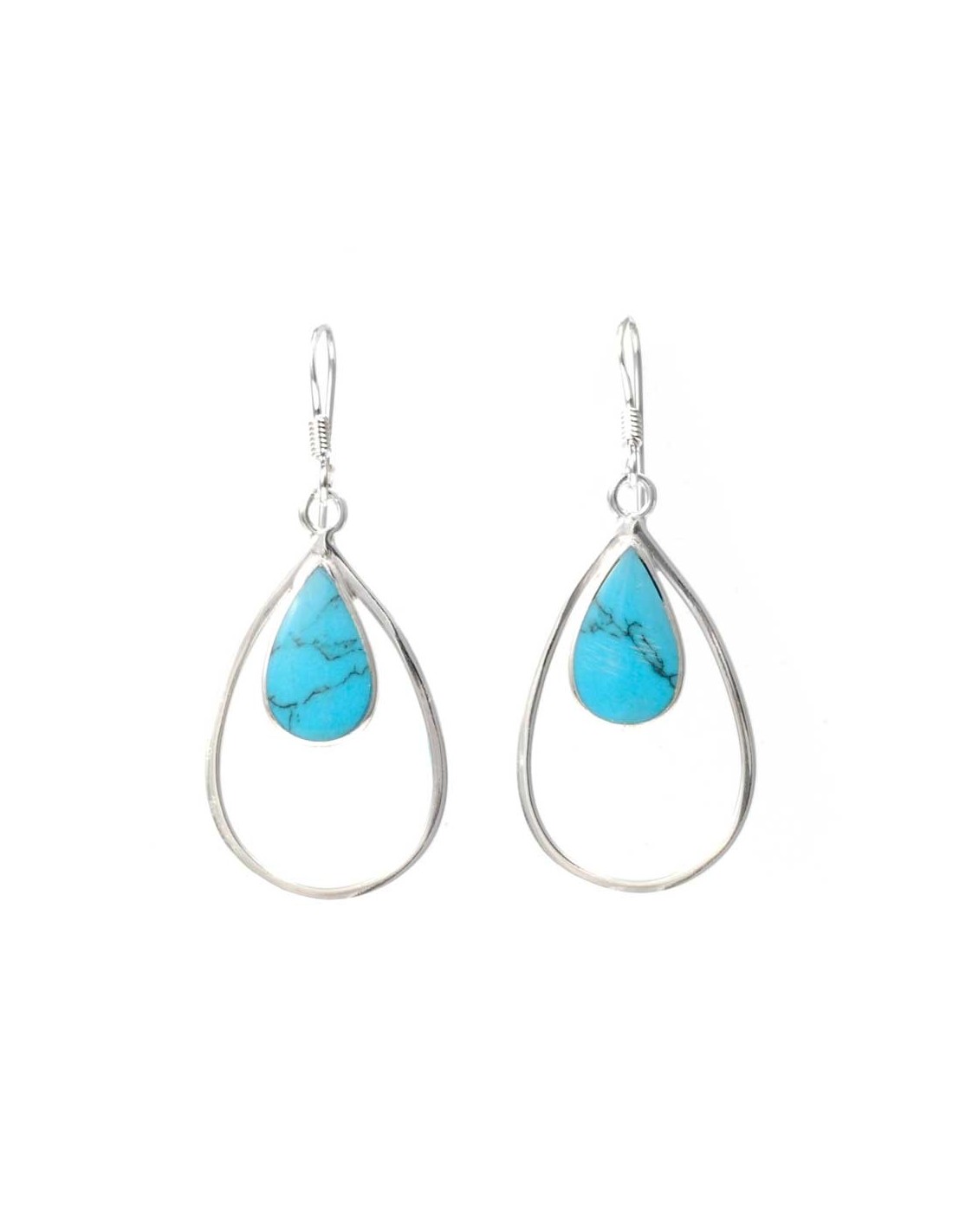 A beautifully elegant pair of handcrafted earrings, featuring a sterling silver loop enclosing a teardrop-shaped natural stone. These stunning earrings are available in Abalone Shell, Mother of Pearl or Reconstituted Turquoise.