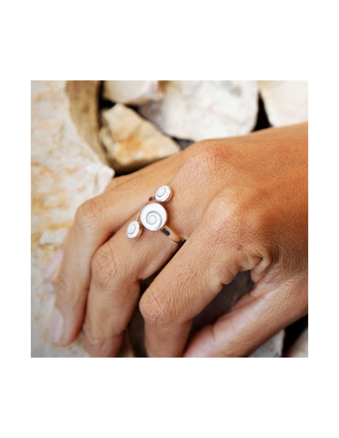 This stunning, symbolic ring is handcrafted from sterling silver and Eye of St Lucia shells. A perfect special gift for a loved one!