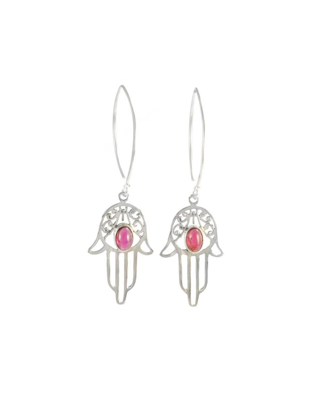 Ces boucles d’oreilles col de cygne en argent représentent la main de fatma. Dans sa paume a été insérée une petite pierre naturelle ovale.