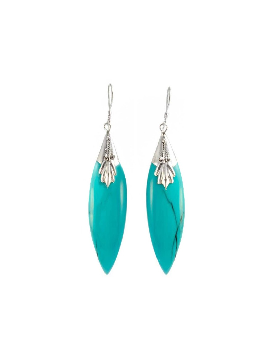 Ces boucles d’oreilles pendantes en argent habilleront vos oreilles et votre port de tête avec grâce. La forme en fuseau de la pierre lui confère finesse et élégance.