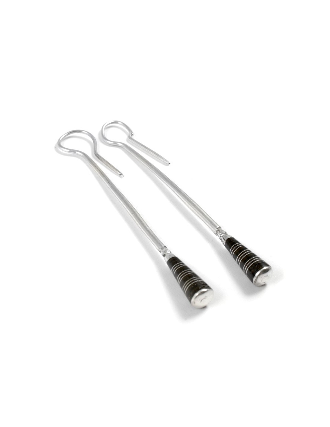 Les boucles d’oreilles touareg longues se déclinent en 5 modèles. Si la forme reste la même, l’utilisation et la quantité des bandes d’ébène diffèrent. Certains modèles sont également légèrement gravés.