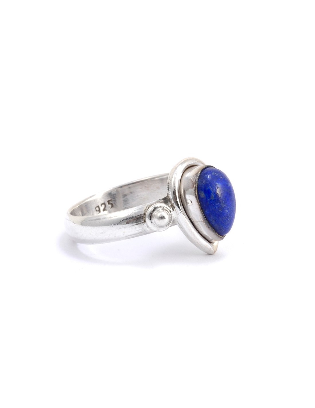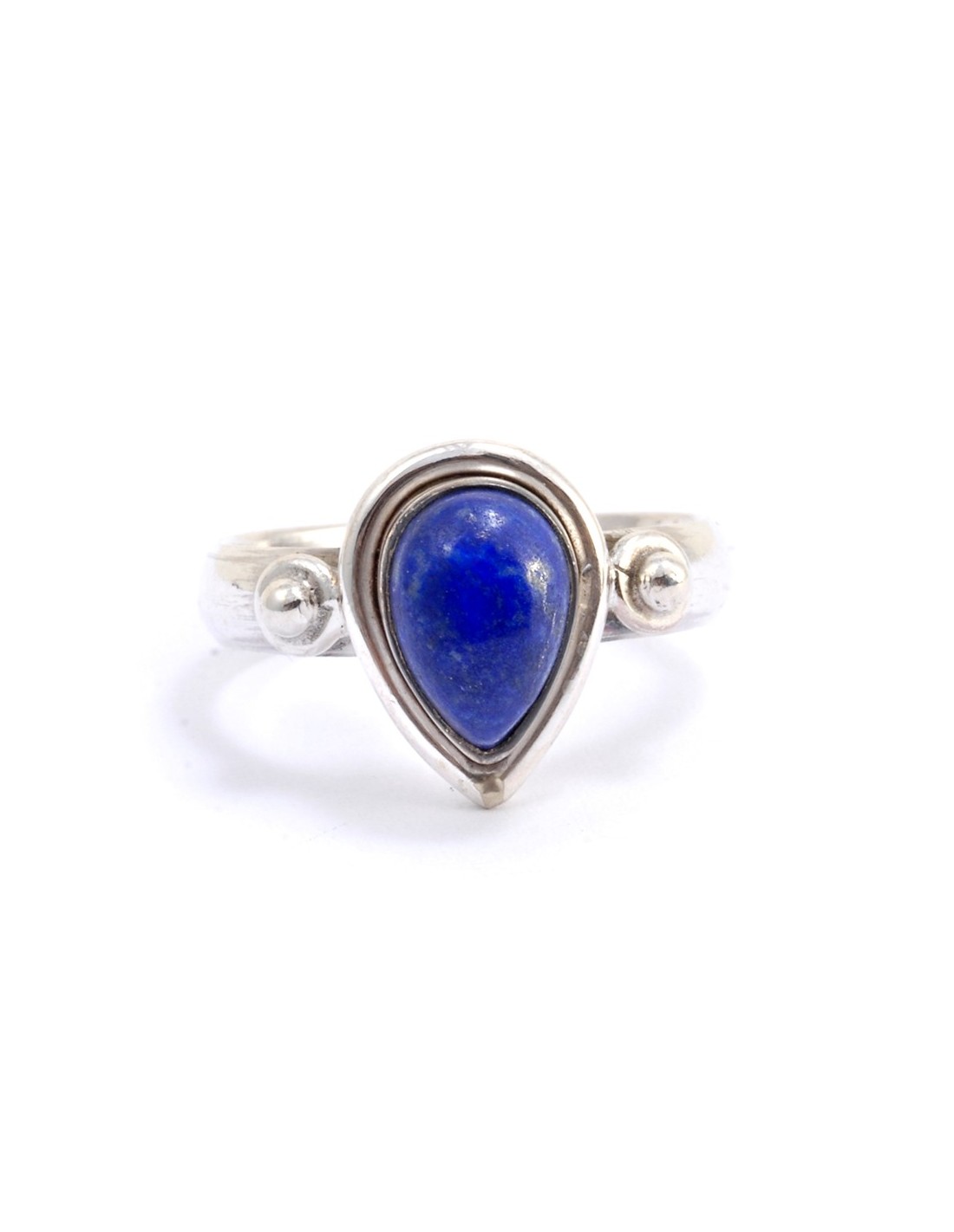 Cette petite bague en argent est composée d’un anneau fin sur lequel a été posée une pierre naturelle en forme de goutte. La monture est légèrement épaisse et deux billes d’argent sont disposées de chaque côté.