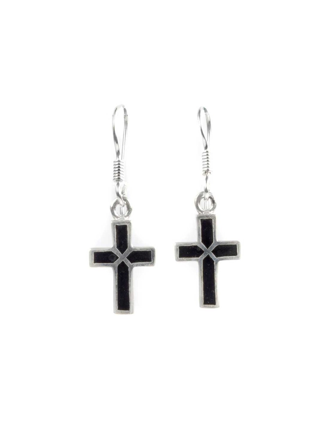 Petites boucles en argent en forme de croix incrustée de pierres naturelles: turquoise, vert turquoise, onyx, nacre et abalone.