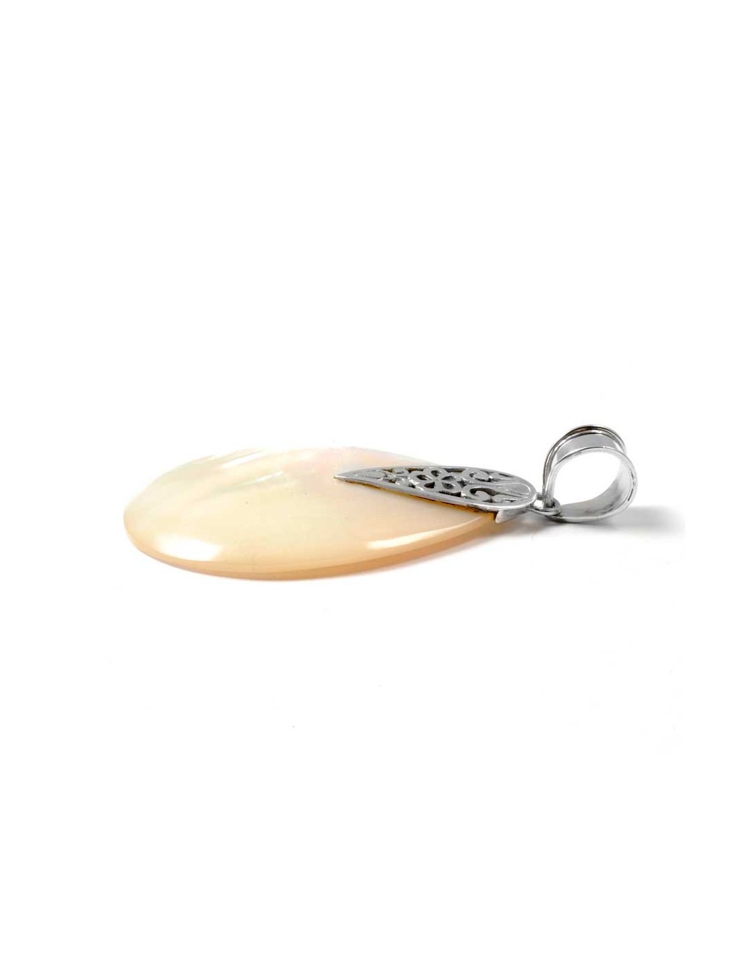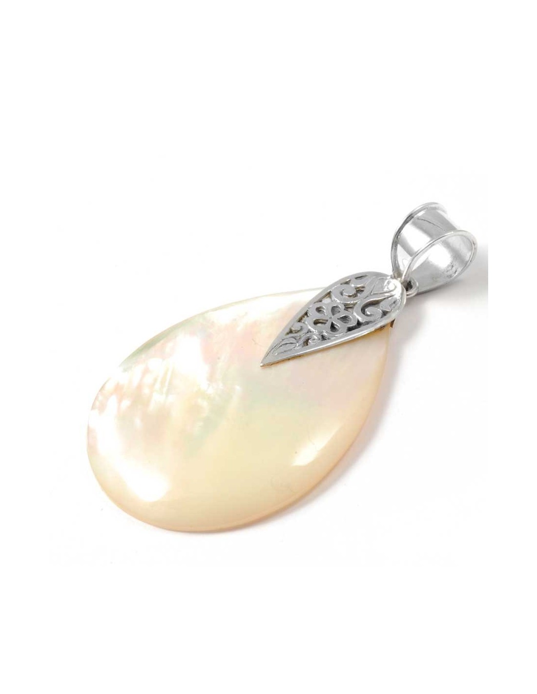 Ce joli pendentif en argent est constitué d’une pierre naturelle en forme de goutte attaché à la bélière par un joli chapeau en argent. Ce chapeau est en forme de goutte inversée. Il est ouvragé de volutes et de fleurs.