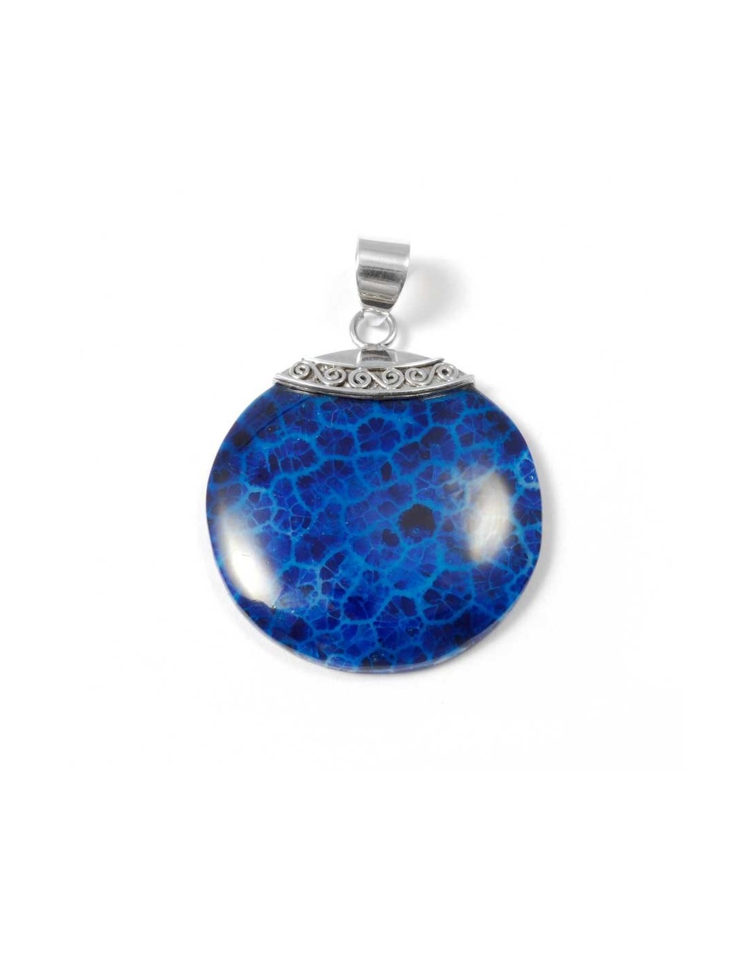 La pierre naturelle a été taillée en forme de rond et est attachée à la bélière par un discret chapeau en argent. Sur ce dernier ont été dessinés de petits motifs en spirales.