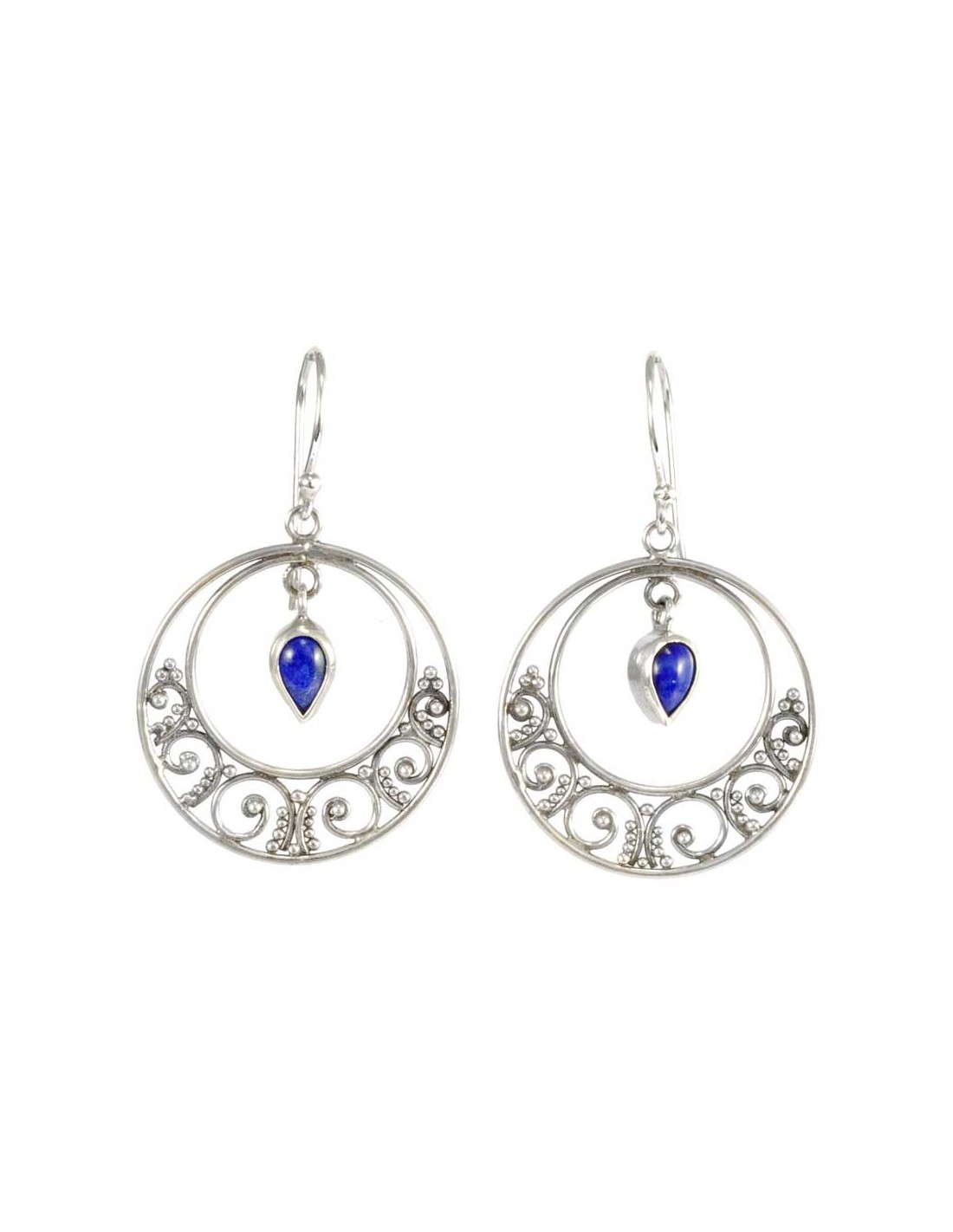 L'argent a été travaillé en petites billes et en volutes tandis qu’une pierre naturelle en forme de goutte inversée a été suspendue au milieu de la boucle d’oreille.Elle semble ainsi flotter avec légèreté au centre du bijou.