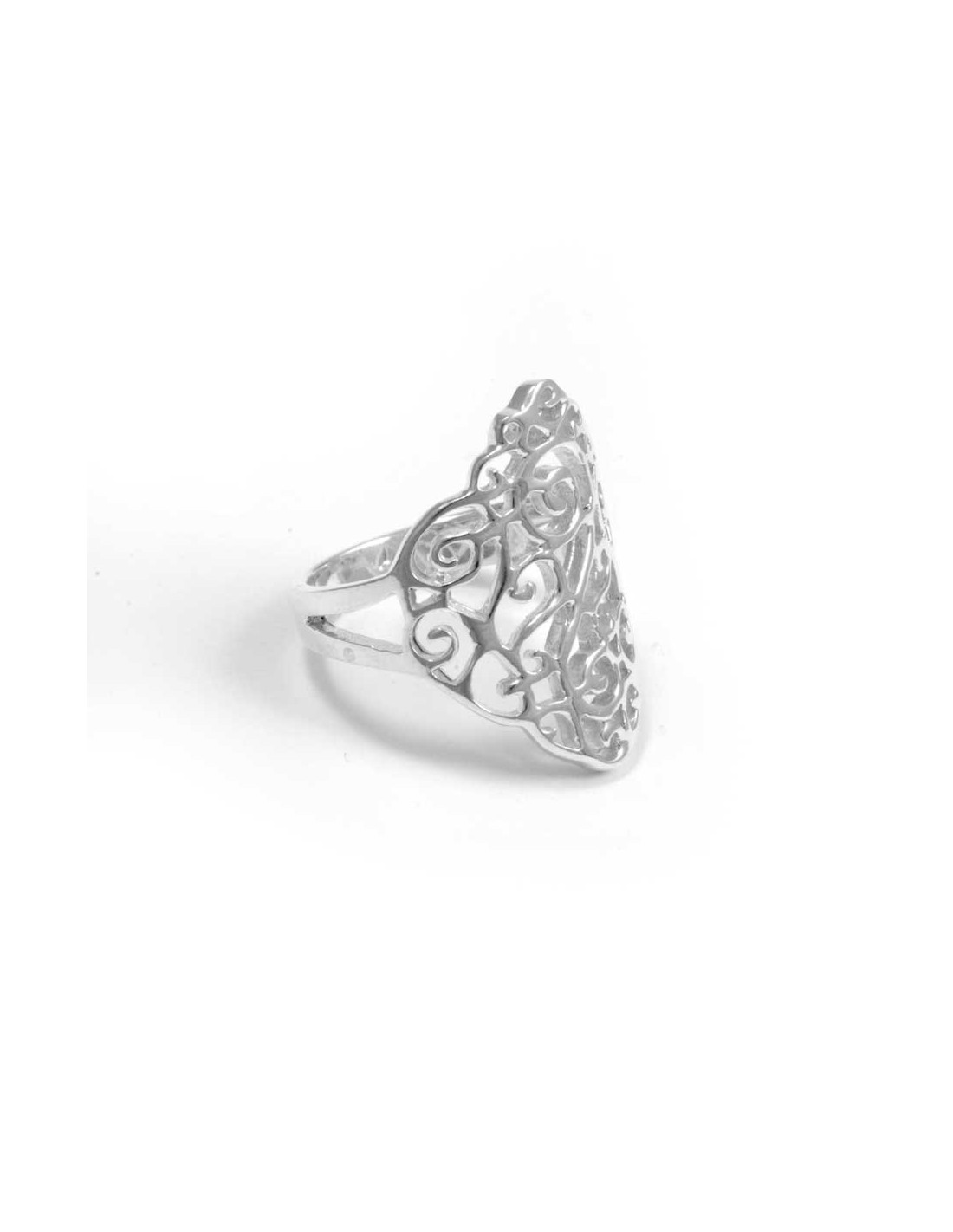Cette bague en argent est entièrement ajourée pour laisser apparaître de jolies volutes. Ces motifs abstraits créeront un subtil effet sur votre doigt, comme couvert de fils d’argent. Assez grande, elle recouvrira votre phalange et ornera élégamment votre doigt.