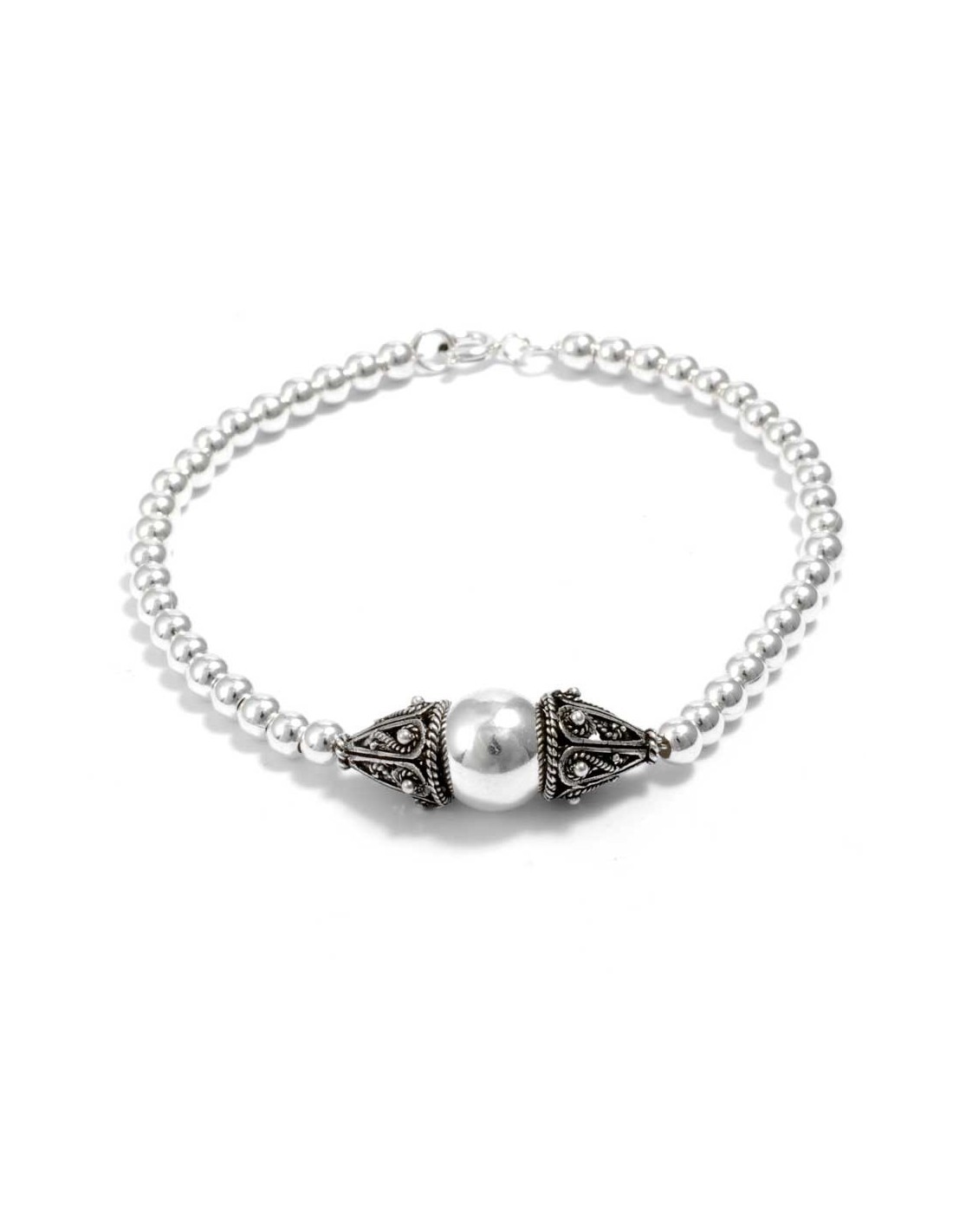 Ce bracelet en argent et composé de perles de tailles différentes. Ce bijou est souple et s’attache grâce à un fermoir en argent. Les trois perles principales sont ornées de collerettes striées et donc plus foncées. Les perles les plus grosses sont ainsi mises en valeur.