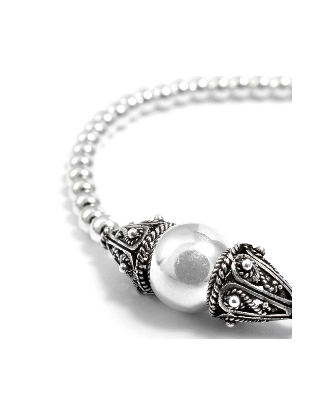 Le bracelet est confectionné avec des perles d’argent vieillies ce qui lui confère un aspect plus authentique.